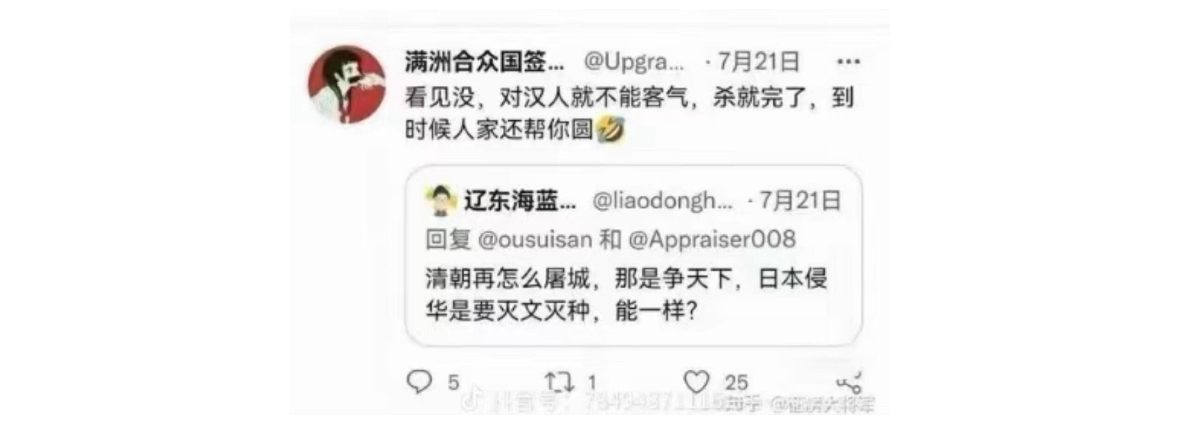 至于说清朝这个朝代,可以客观的去看待,它是文明延续上的一环,你无法去假设如果不是清朝我们的文明进程是什么样子。但是,现在那一批搅局的满遗,绝对要挖出来并摁死,因为他们是纯纯的居心叵测,倒反天罡!