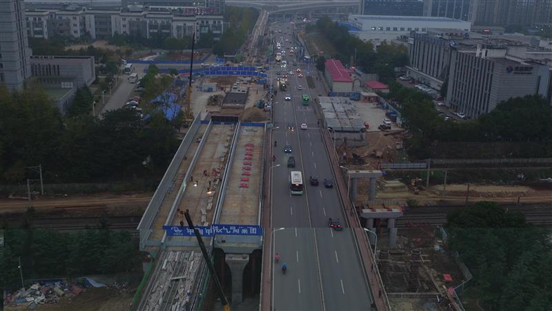 目前,现有的关山大道为双向4车道,为缓解拥堵,同时满足光谷有轨电车T1线运行,在现有的关山大道跨南环铁路桥左右两侧再新建三幅桥。